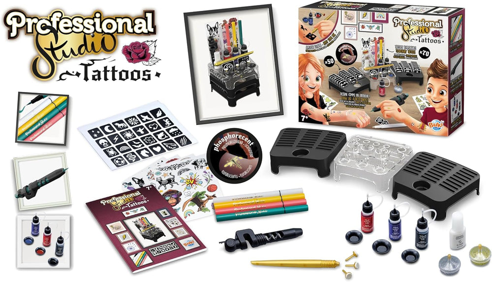 BUKI France Profesionální studio tetování | Kreativní sada pro děti od 7 let – třpytivá, svítící a voděodolná dočasná tetování