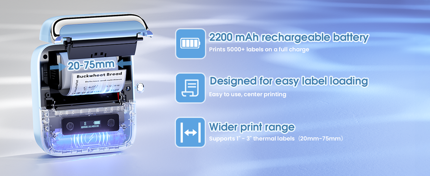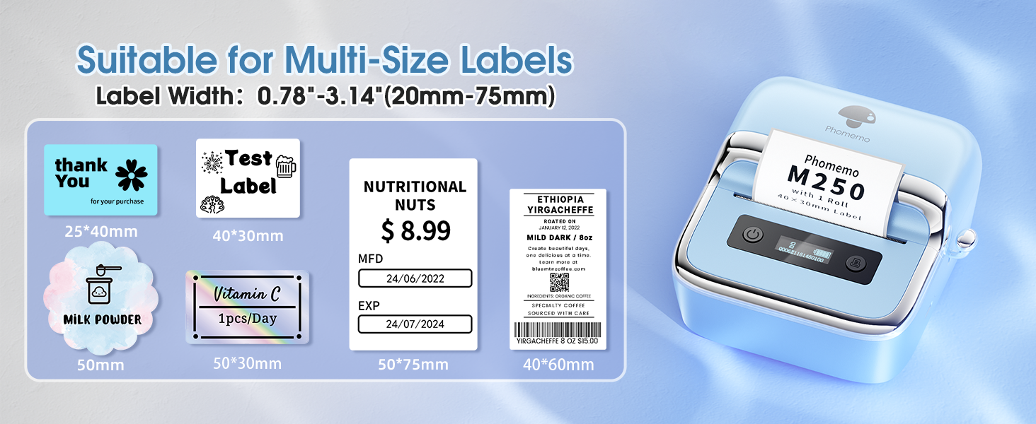 The Phomemo M250 allows you to print extra wide labels, opening up new possibilities for labeling products, packages and household items. Ideal for: