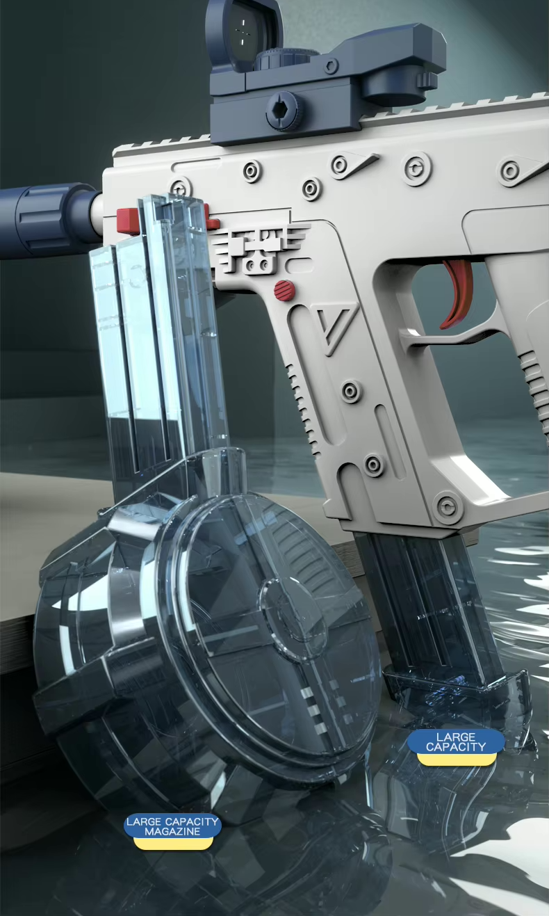 The gun is equipped with two tanks: a main tank with a capacity of 434 ml and a spare tank with a capacity of 58 ml. This combination ensures long-lasting play without frequent refilling of water. When the main tank runs out, simply switch to the spare tank and continue the action without interruption.