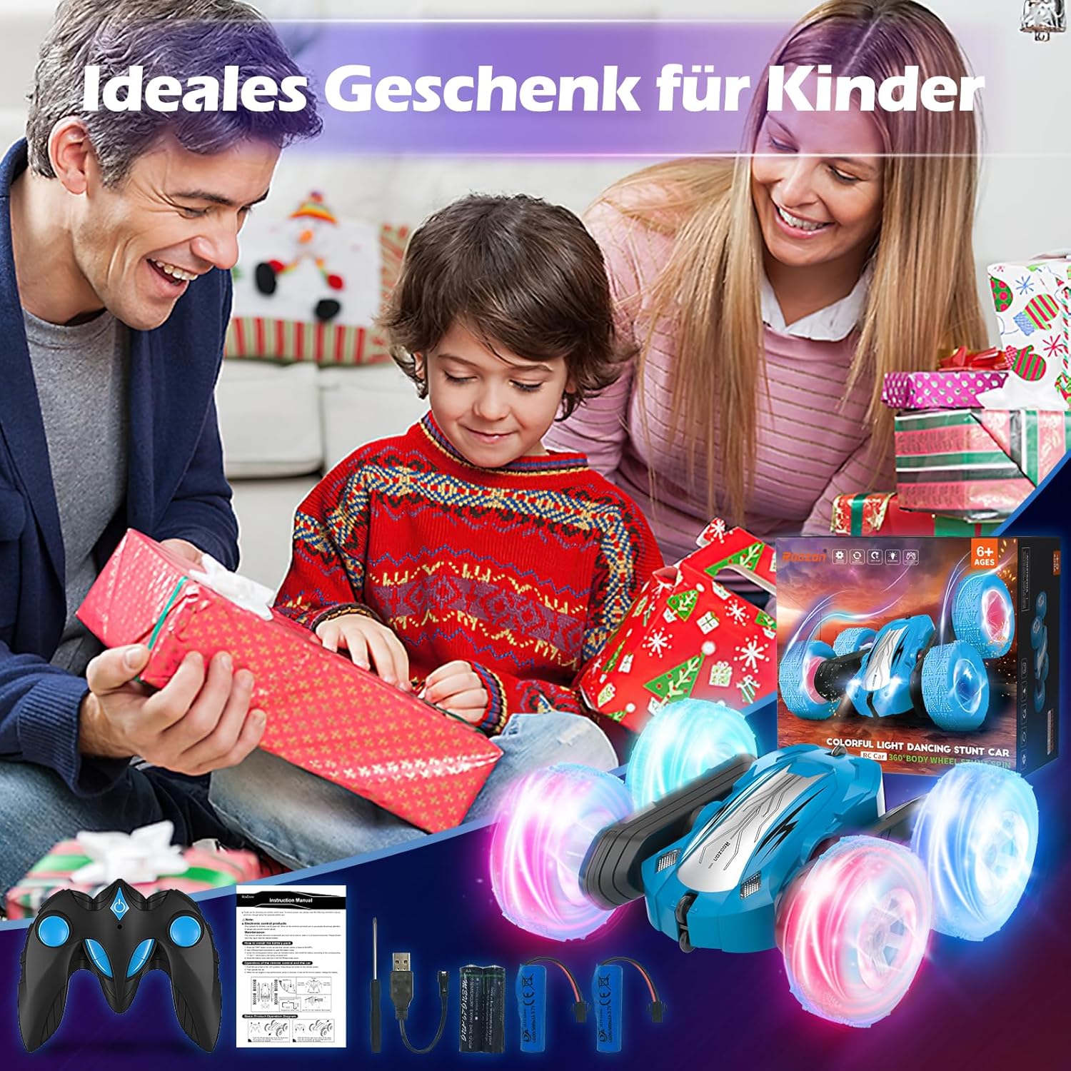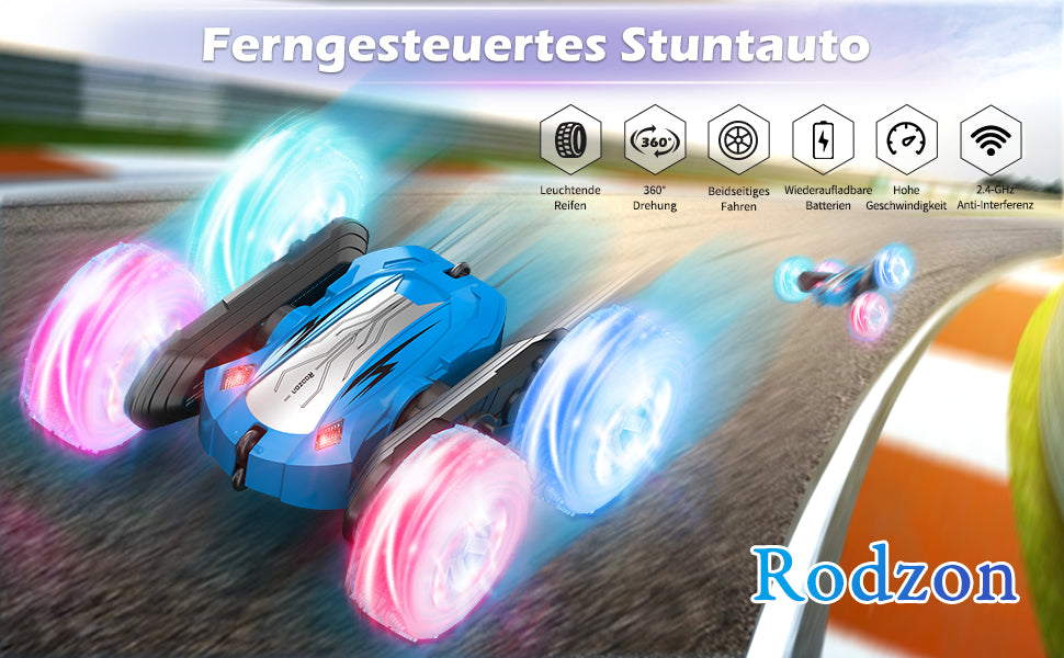 Experience endless fun with the Rodzon RC Stunt Car , which combines speed, light effects and action driving. With its durable construction, double-sided design and colorful LED lights, it is ideal for playing indoors and outdoors - on the sand, in the garden, on the carpet or on the beach. Children from 3 years old will enjoy a dynamic ride full of tricks and stunts.
