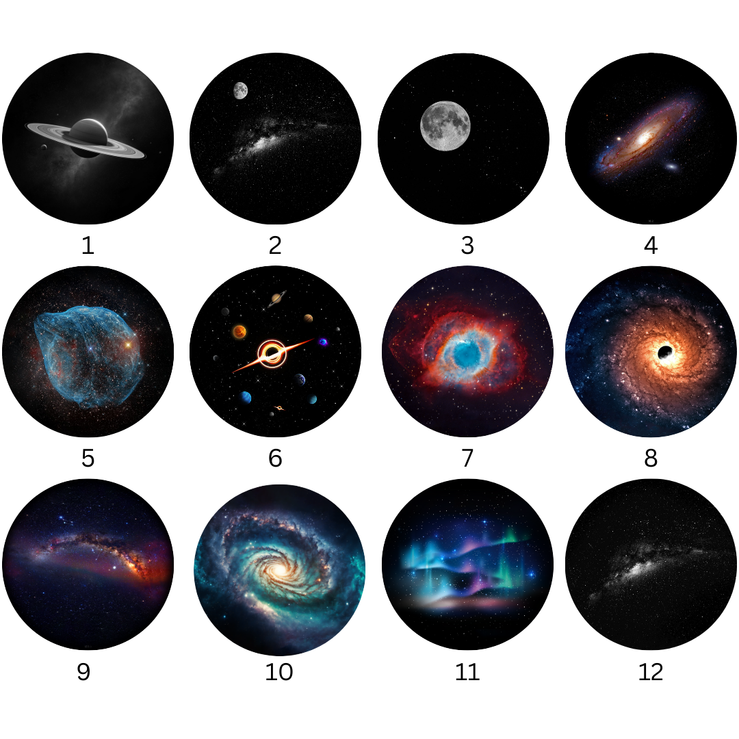 • 12 cserélhető kazetta/lemez: A planetárium számos lemezt kínál, amelyeket közvetlenül a projektorba lehet helyezni, így valósághű képeket vetíthetünk galaxisokról, bolygókról és csillagokról. Minden kép valódi teleszkópos fotókon alapul.