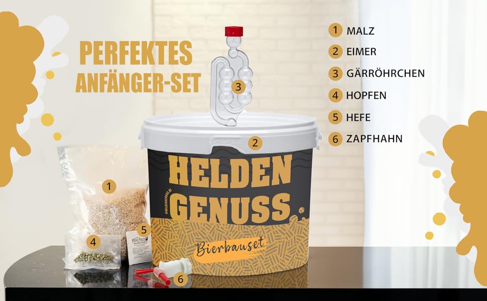 The Heldengenuss set contains real malt and real hops , so you can enjoy the authentic beer-making process from the first brew to the first tasting.