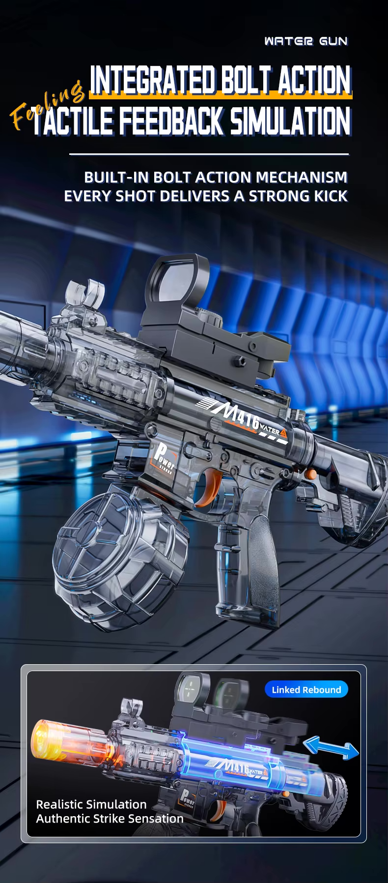 Tento model nabízí integrovaný pohyblivý mechanismus závěru (bolt action), který při střelbě vytváří realistický vizuální i hmatový efekt.