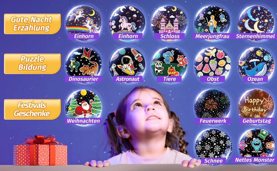 Projection themes: 15 films (starry sky, fairy tales, ocean, animals, unicorns, astronauts)