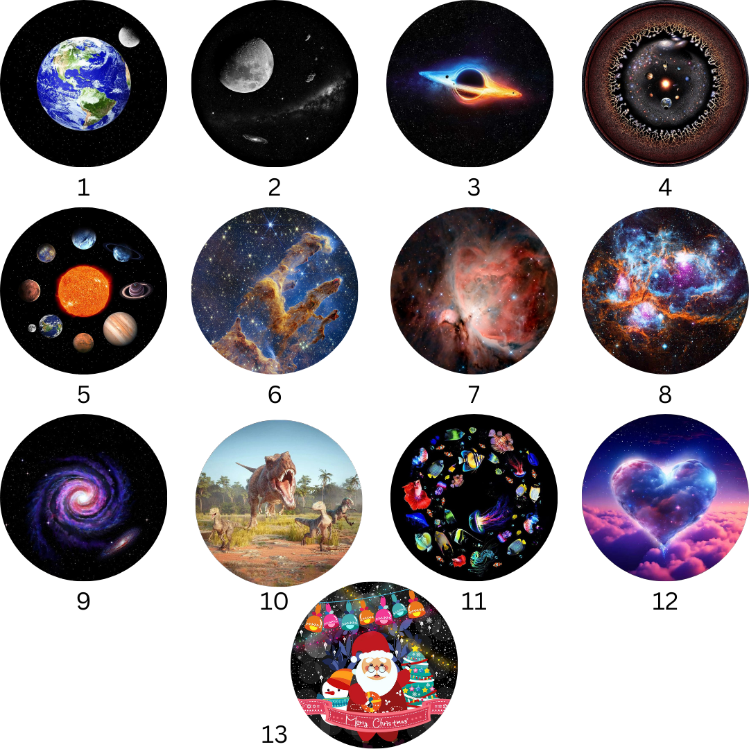 It includes 13 cassettes with 4K quality images. Among them you will find realistic views of the universe (Earth, Moon, Solar System, nebulae, galaxies), but also special themes such as dinosaurs, sea world, Christmas or Valentine's Day.