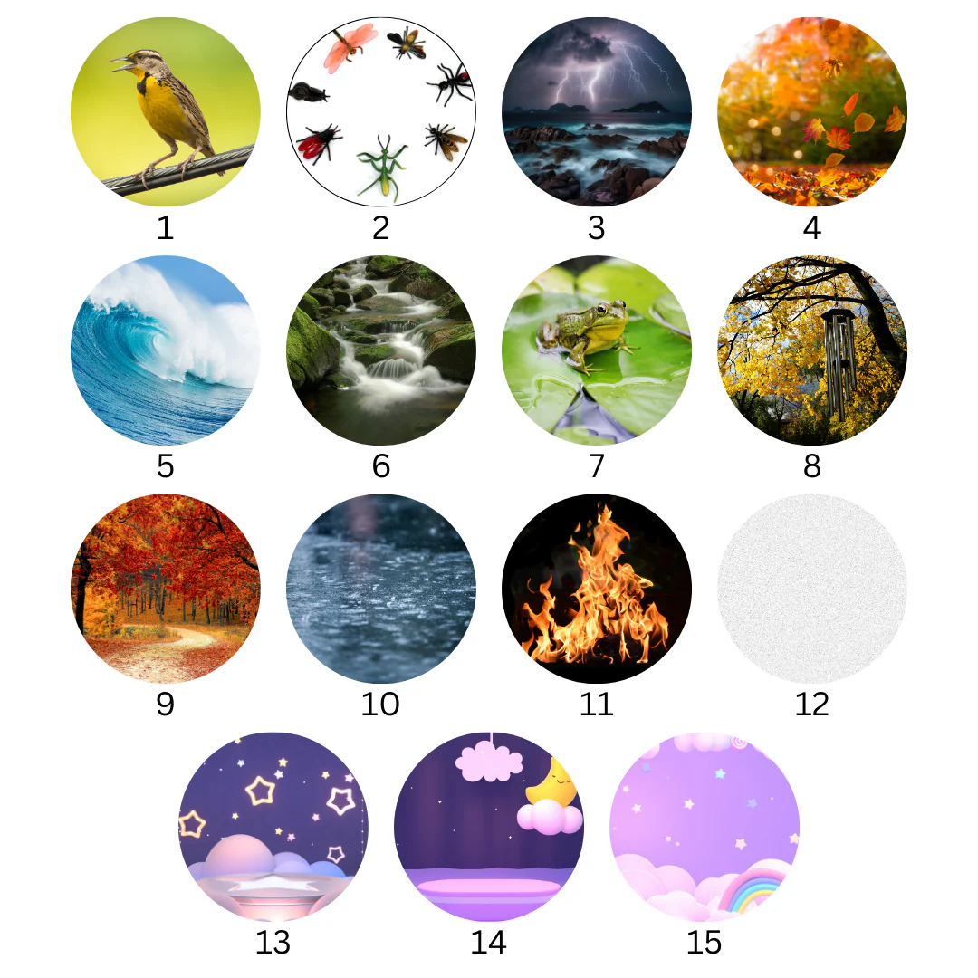 • birdsong, insect sounds, lightning, falling leaves, sea waves, flowing water, frogs croaking, wind chimes, autumn atmosphere, rain, crackling fire, white noise, lullaby 1, lullaby 2, lullaby 3