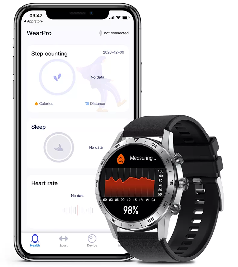 Main features: Mobile application for IOS/Android, breathing training, stopwatch, brightness control option, multi-sport modes, sleep control, heart rate, blood oxygen measurement, incoming sms and call notifications, weather, find phone app (available after connecting to mobile phone), music playback, password protection, calculator, split screen display, custom shortcut function widget, weather, voice assistant, QR code display