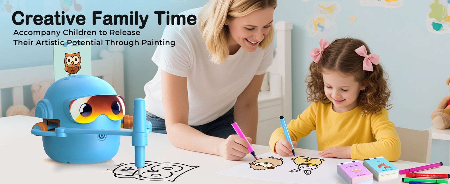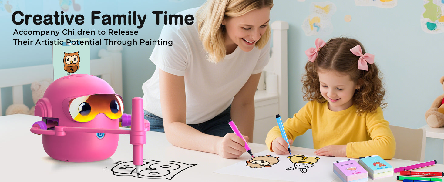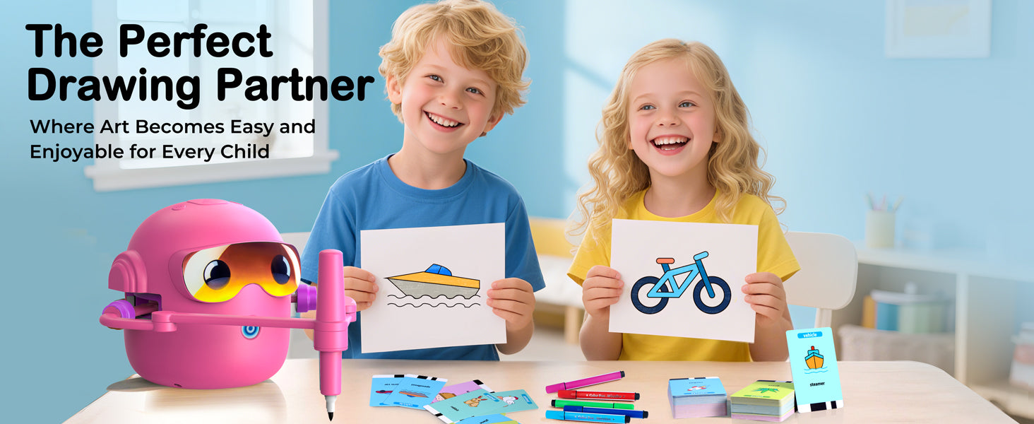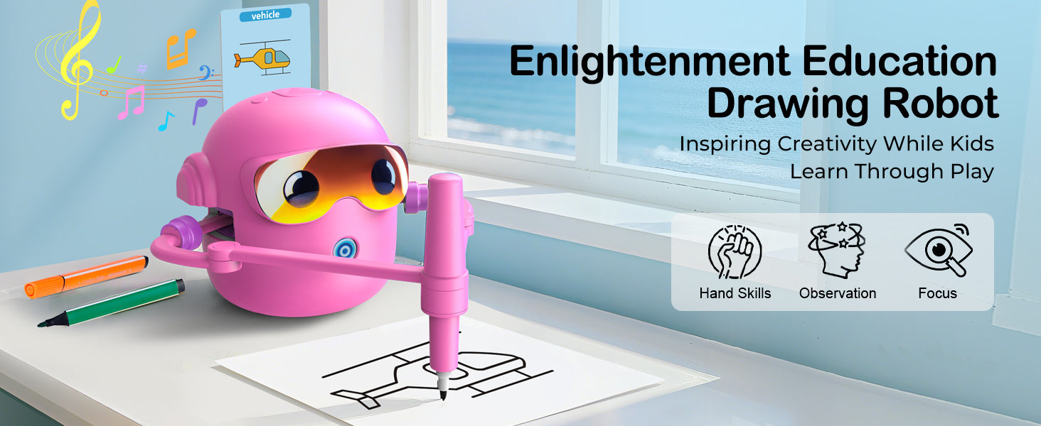 Objevte zábavný způsob, jak děti naučit kreslit! Interaktivní kreslící robot je inspirovaný principy Montessori a pomáhá dětem rozvíjet kreativitu, jemnou motoriku i představivost. Díky jednoduchému systému kreslení podle karet zvládnou vytvářet obrázky i úplní začátečníci. Robot navíc přehrává veselou hudbu, která zpříjemní každou tvůrčí chvilku.