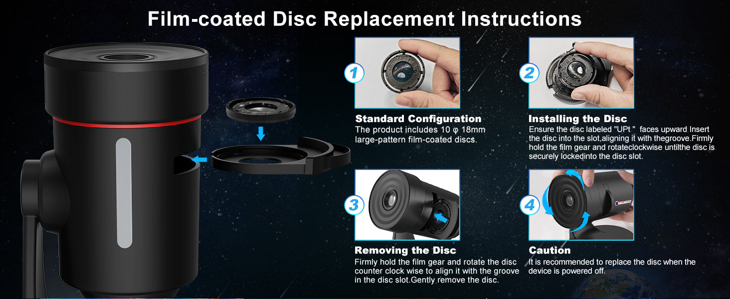 The package includes 10 replaceable cartridges with realistic 4K images of space and other themes.