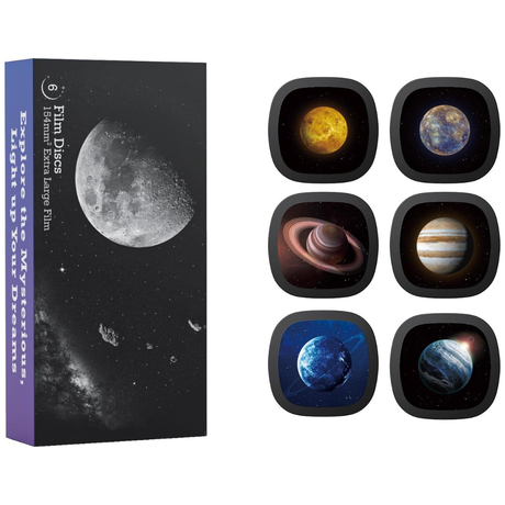 The package includes a total of 13 interchangeable film cassettes with various images - from the Moon and Earth to Dinosaur World and Sea Animals.