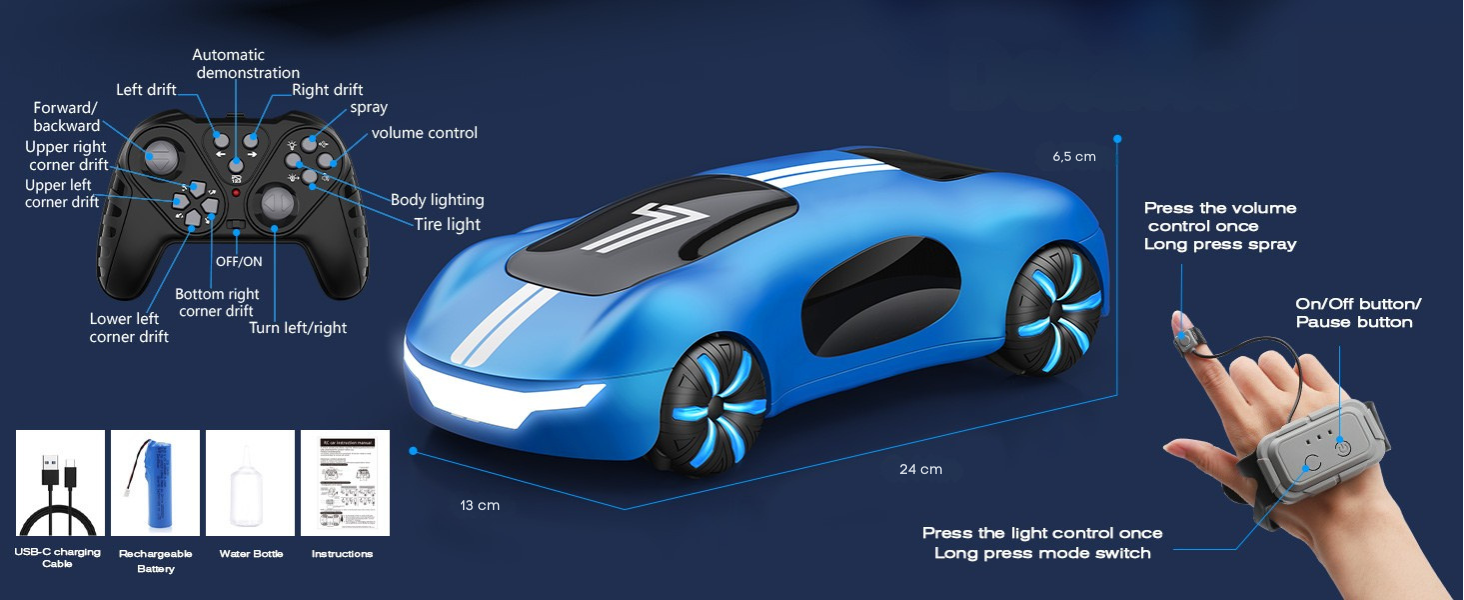 • 2 režimy ovládání: Použijte klasický 2,4 GHz dálkový ovladač nebo futuristický ovladač na zápěstí, který reaguje na vaše gesta – auto se otáčí, driftuje a dělá kaskadérské triky podle pohybů ruky.