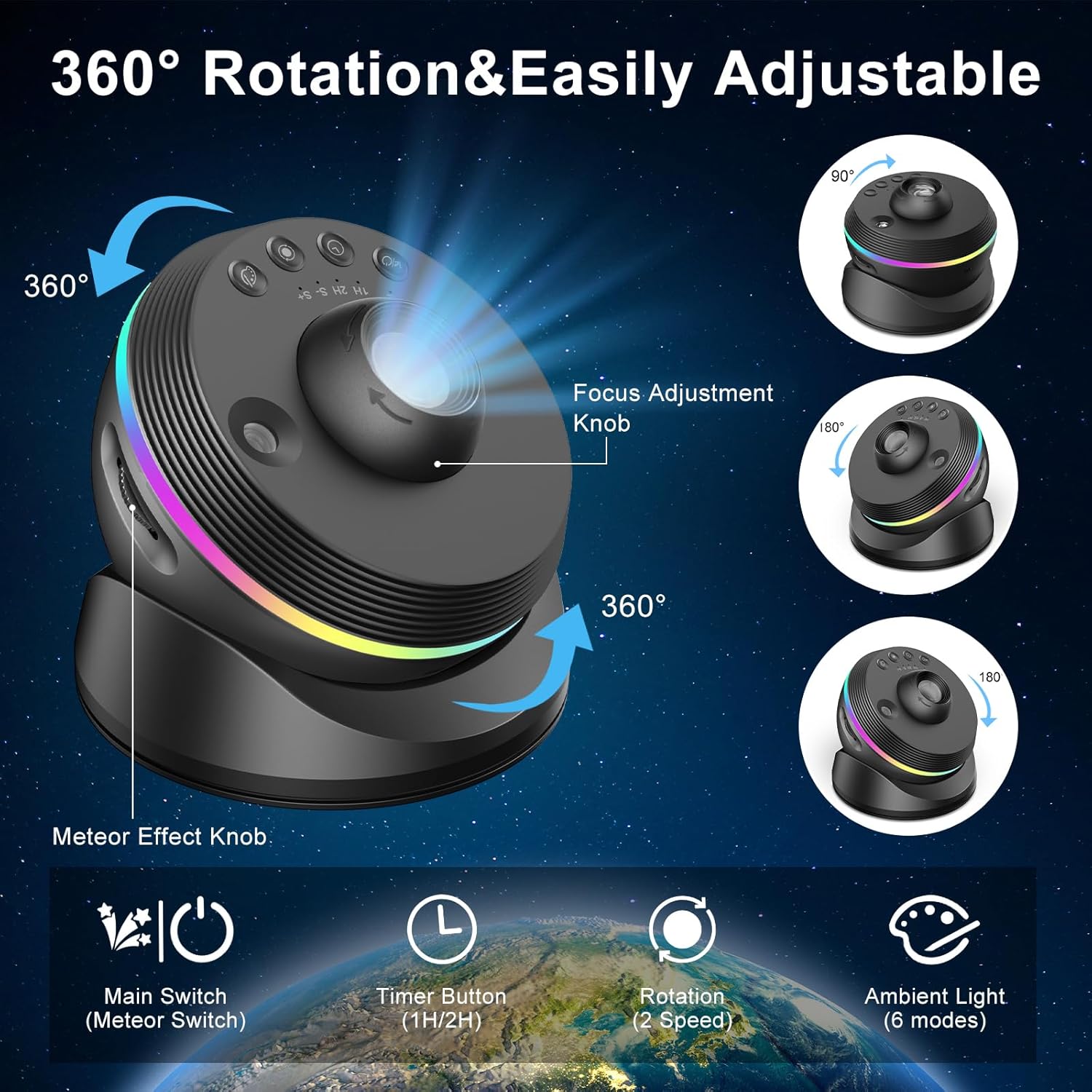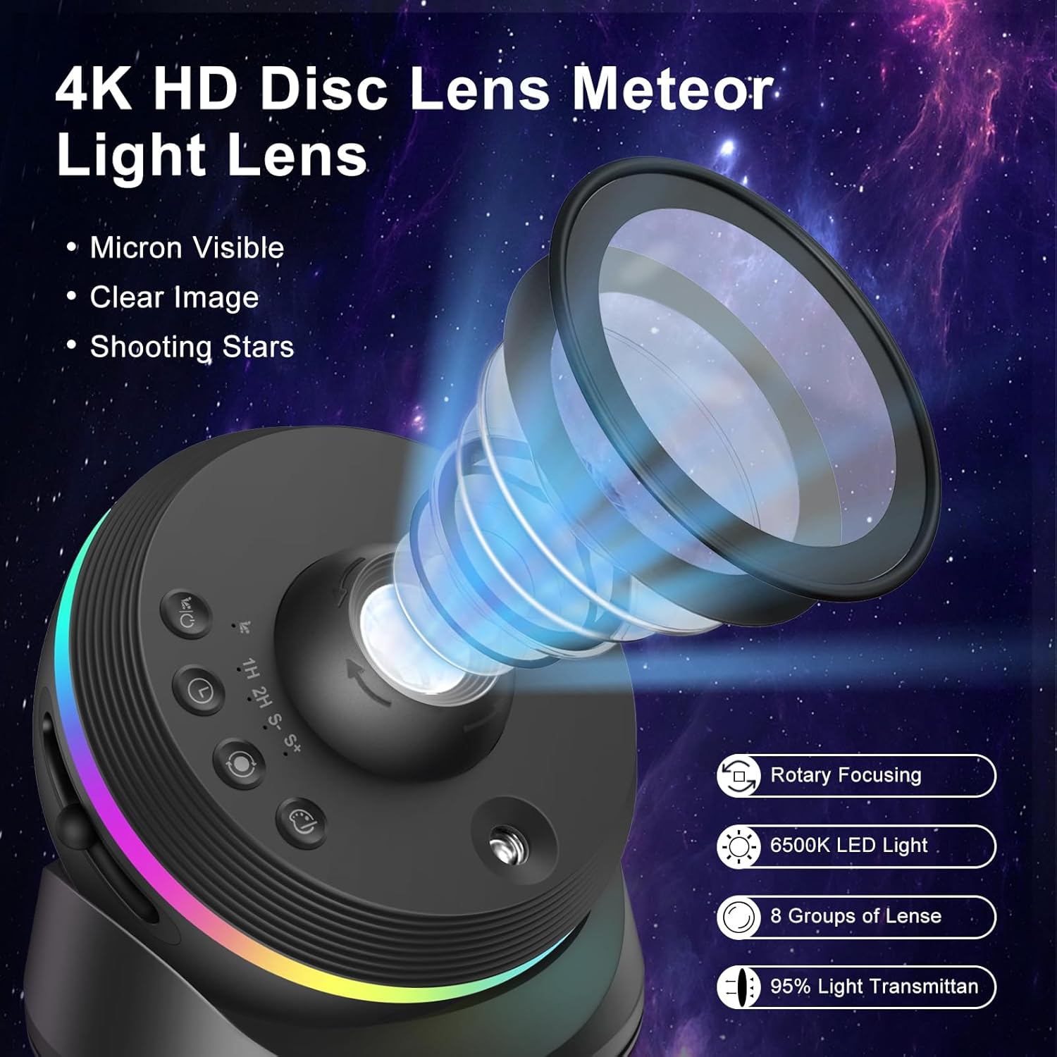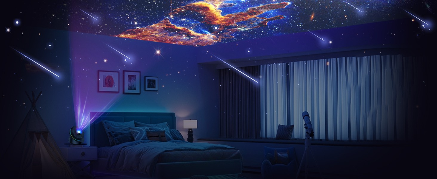 Projektor funguje pomocí 13 výměnných kazet se snímky ve 4K kvalitě, které zobrazují fascinující vesmírné scenérie i tematické motivy. Samozřejmostí je oblíbená funkce simulace padajícího meteoritu, která dodává projekci realistický a pohlcující efekt.